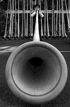 ALPHORN: Impresionante instrumento suizo con forma similar a la del didgeridoo, construido de madera, de forma artesanal, con orificios de entrada y salida de aire con el que pueden hacerse diferentes notas a base de cambios de presión.