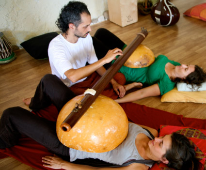 Masaje sonoro con Veraveena (tanpura-didjeridú) instrumento inventado por Joel Olivé, Músico, Músicoterapeuta y terapeuta del sonido.